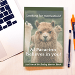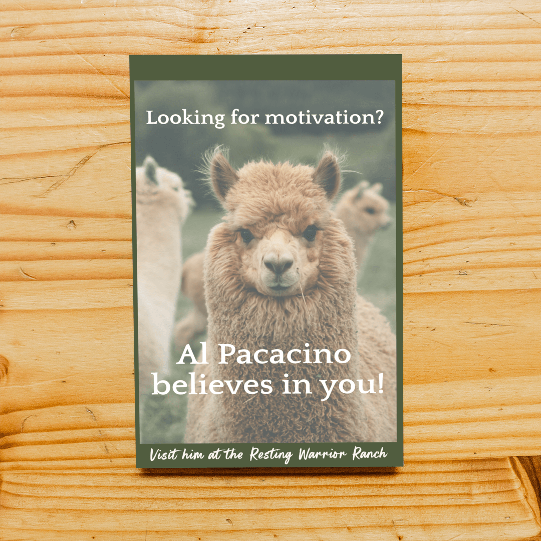 This collectible art sheet is sized to fit into your favorite Garnet Bend novel... or you can frame it and display this vellum with pride! This 5x8 inch piece of art features a motivational message from everyone's favorite Resting Warrior Ranch alpaca!